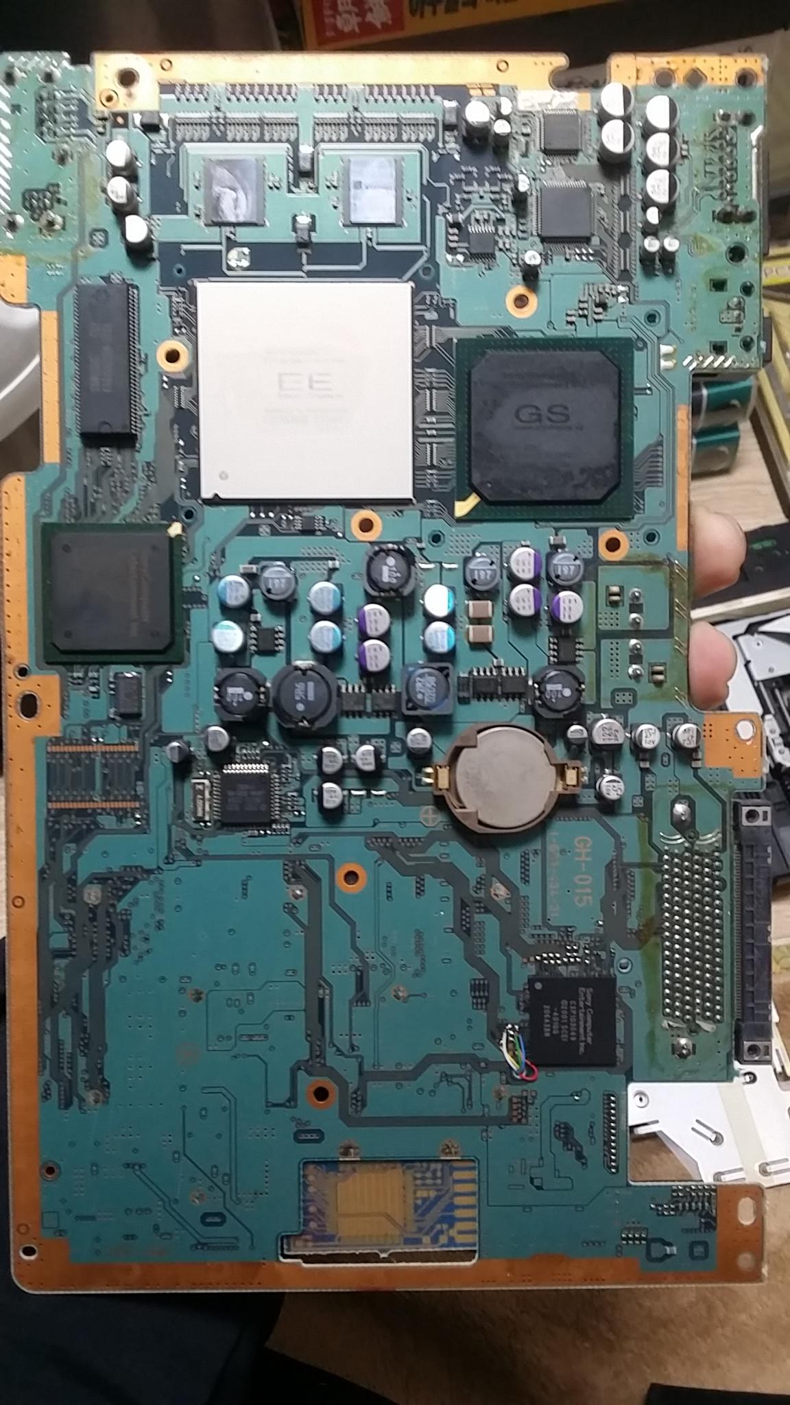 30005번 메인보드. 과거 말이 많았던 논란의 그 칩도 보이는군요. 부착위치를 보아 용산 피카소발로 기억합니다. (칩 이름은 블루 메시아이며, 메시아칩 클론이기도 합니다. 기능은 기존 메시아칩과 동일하며, PS1 CD를 부팅시키려면 미리 CD를 넣어놓고 전원 버튼을 살짝 길게 눌러줘야 부팅이 가능합니다. 이 칩에 대해 필자가 약간 아쉬웠던 점을 잠시 논하자면, 플스2 마지막 시즌에 나온 모드칩들의 경우 PS1의 복사방지 프로텍션에 대해 완벽하지는 않지만 대략 80% 정도 CD파일에 패치를 입히지 않고서도 우회가 가능했지만 메시아 모드칩의 경우 거의 초창기에 나온 모드칩인 탓인지 우회기능이 전혀 없다는 점 입니다. 그 외 PS2 모드칩의 끝판왕인, DMS4 나 Matrix infinity 처럼 첫 플투 실행시 부트옵션을 통해 별 다른 설정을 지정할 수 있는 옵션도 존재하지 않음. 단 크리스탈 모드칩 외 몇 가지 다른것들과 달리 McBoot(메모리 카드 부팅) 충돌은 없습니다.)